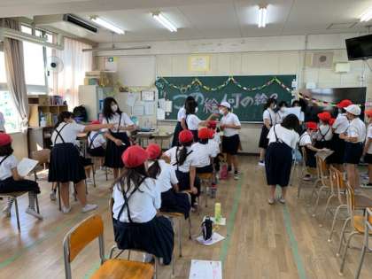 開会式の後、子ども達は自分の学級でお店の係をする側とたてわり班でお店を回る側に別れました。
