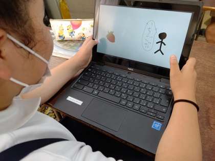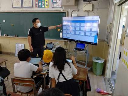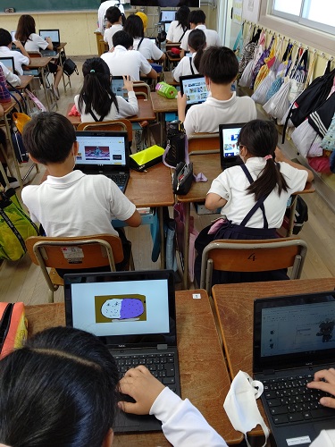 chromebookを使って、Googleスライドでプレゼンを作る練習をしています。