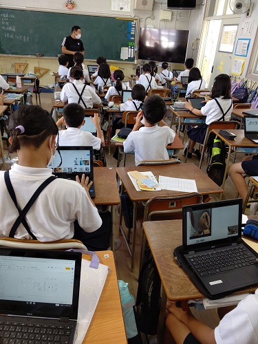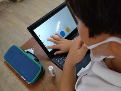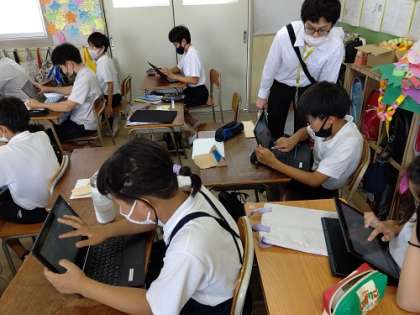chromebookを使って、Googleスライドでプレゼンを作る練習をしています。