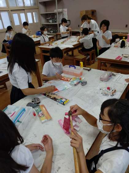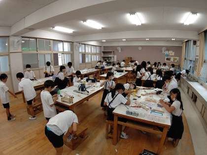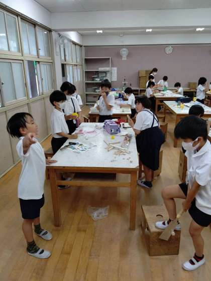 図工で、のこぎりや金づちを使い、作品を作っています。