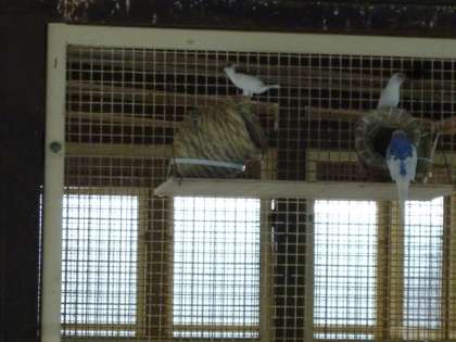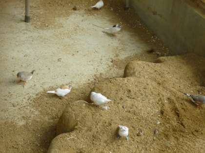 自由気ままに、広い禽舎生活を謳歌している十姉妹(じゅうしまつ)と錦花鳥(きんかちょう)。