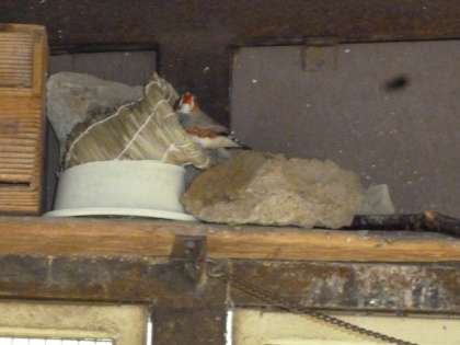 錦花鳥(きんかちょう)が天井の隅にワラをせっせ。(巣作りの前兆かも…)安心して過ごせるワラ巣を設置しました。