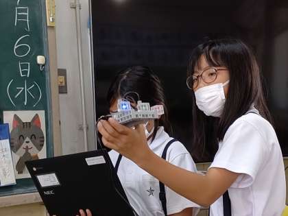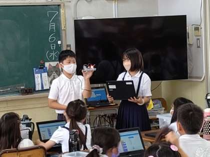 3色のLEDを点灯させるプログラムをみんなの前で発表しています。