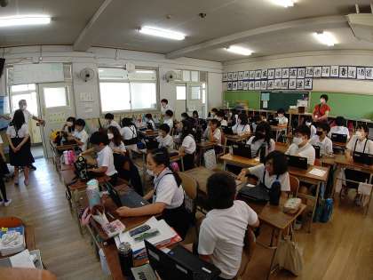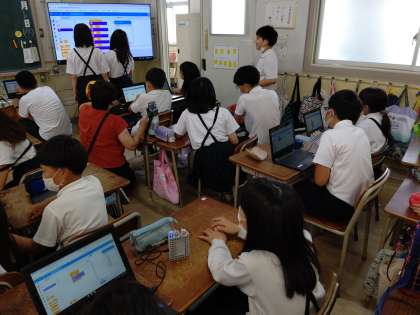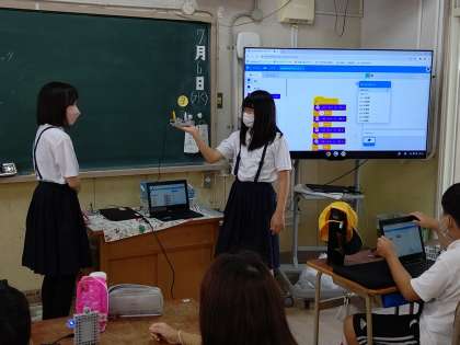 3色のLEDを点灯させるプログラムをみんなの前で発表しています。