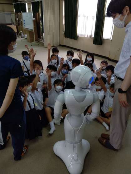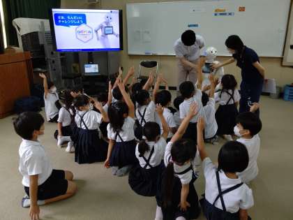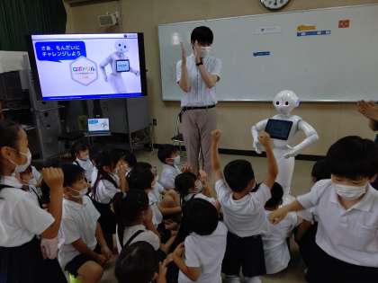 Pepperと、「さあ、もんだいにチャレンジしよう」をしています。