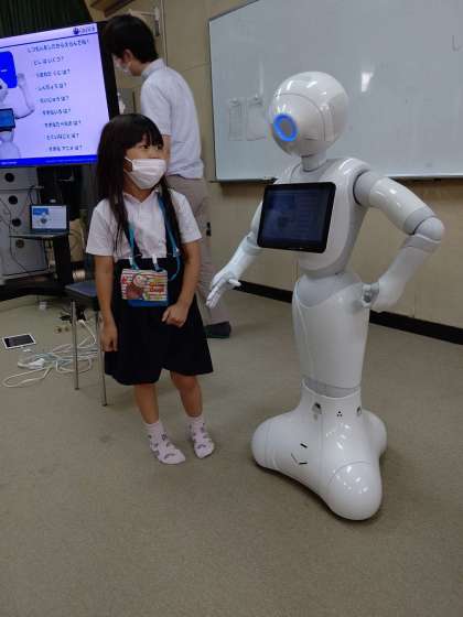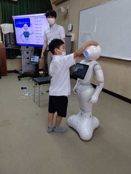 Pepperの「しつもんコーナー」で、頭をさわって質問すると、答えてくれます。