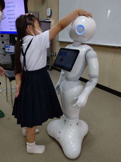 Pepperの「しつもんコーナー」で、頭をさわって質問すると、答えてくれます。