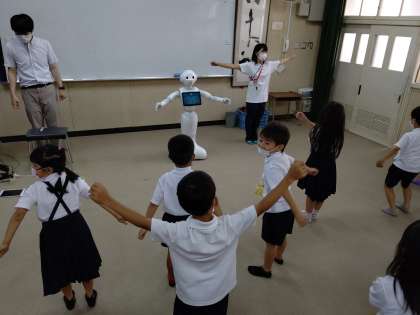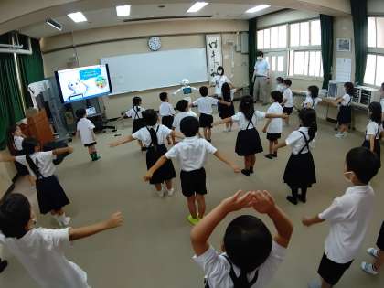 Pepperと一緒に、「ラジオたいそう」をしています。