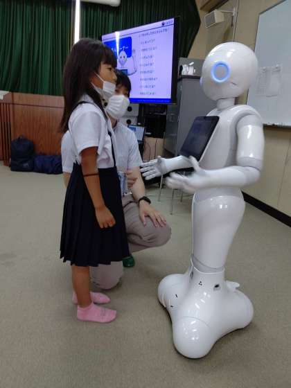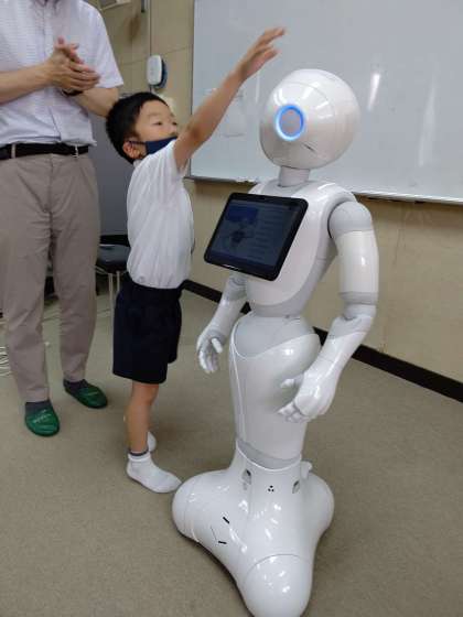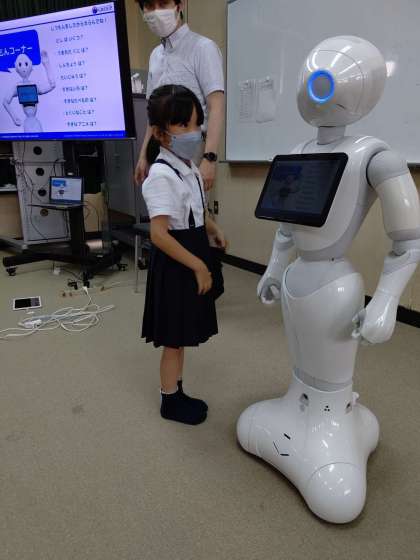 Pepperの「しつもんコーナー」で、頭をさわって質問すると、答えてくれます。