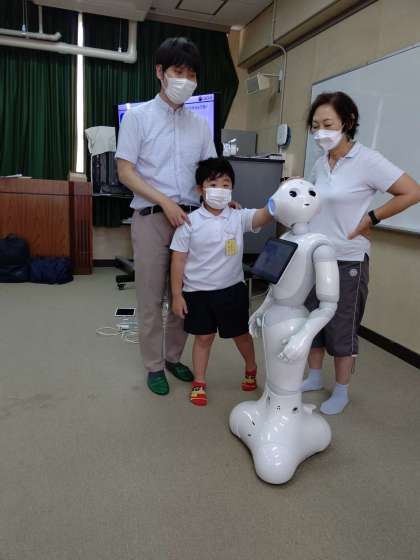 Pepperの「しつもんコーナー」で、頭をさわって質問すると、答えてくれます。