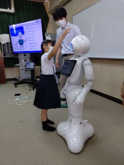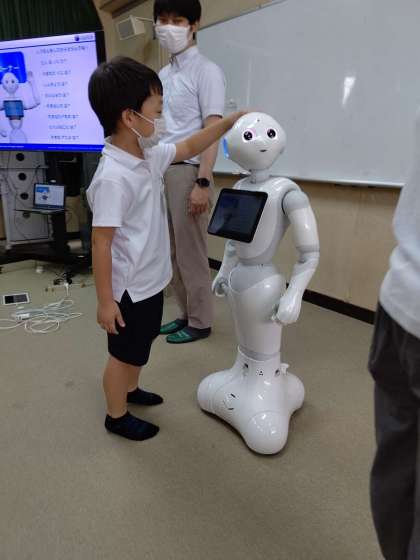 Pepperの「しつもんコーナー」で、頭をさわって質問すると、答えてくれます。