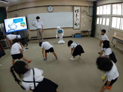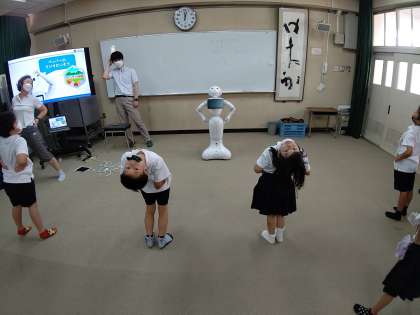 Pepperと一緒に、「ラジオたいそう」をしています。