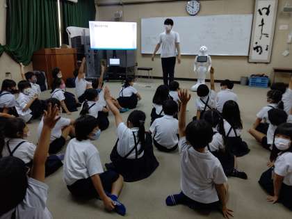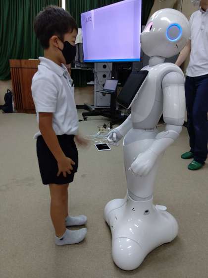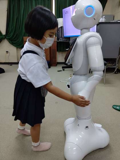 Pepperの「たし算コーナー」で、右手を触ると2けたの数を、右手を触ると1桁の数を、頭をさわってたし算の答えを教えてくれます。