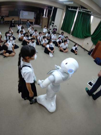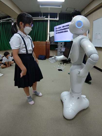 Pepperの「しつもんコーナー」で、頭をさわって質問すると、答えてくれます。