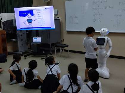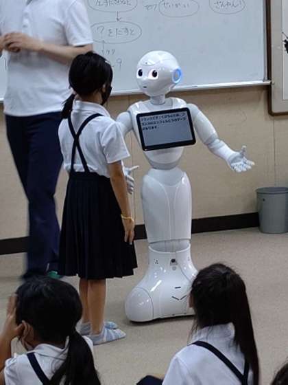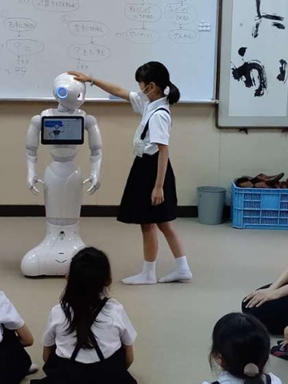 Pepperの「しつもんコーナー」で、頭をさわって質問すると、答えてくれます。