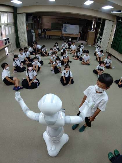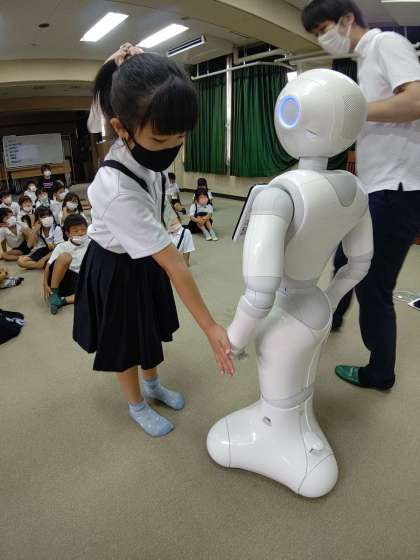 Pepperの「たし算コーナー」で、右手を触ると2けたの数を、右手を触ると1桁の数を、頭をさわってたし算の答えを教えてくれます。