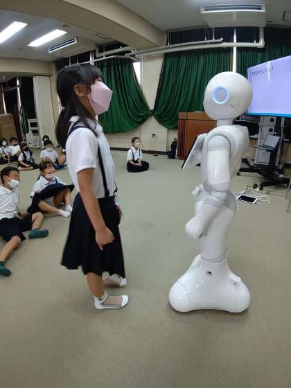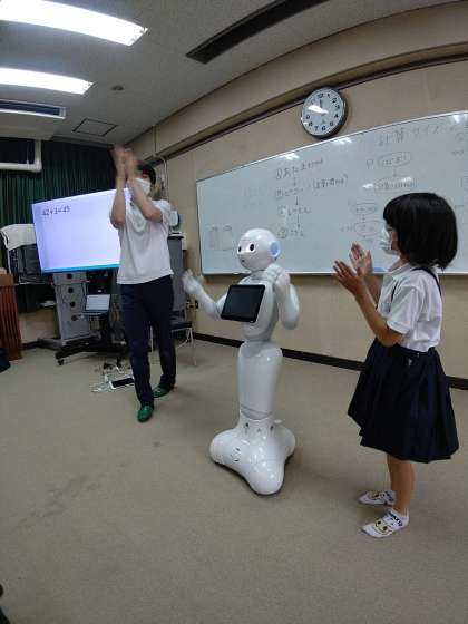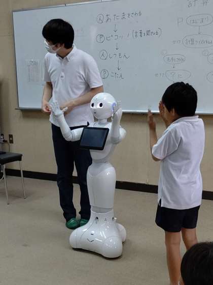 Pepperの「たし算コーナー」で、右手を触ると2けたの数を、右手を触ると1桁の数を、頭をさわってたし算の答えを教えてくれます。