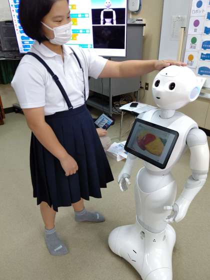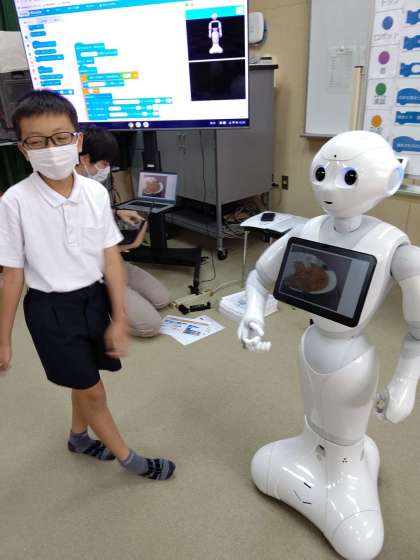 Pepperの頭をさわり、「オムライス、ハンバーグ、スパゲッティ、プリン、カレー、ピザ」と聞くと、画像を表示してくれます。