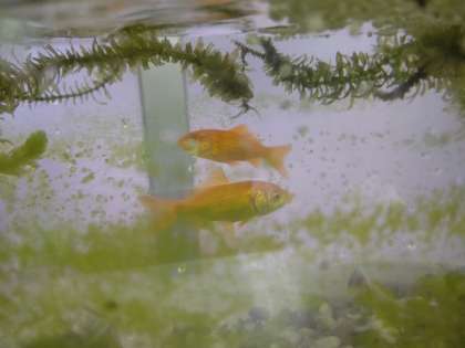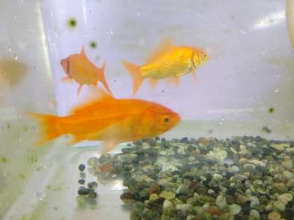職員室の3つの金魚の水槽の水を入れ替え、元気に泳ぎ回っています。