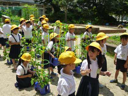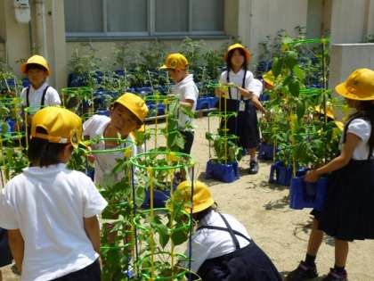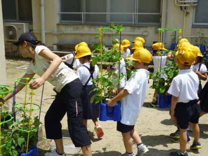 「校長せんせぇ、私のあさがおが○○ちゃんのところにのびて、○○ちゃんのあさがおが倒れそうやねん」