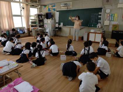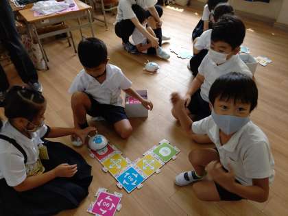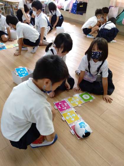 指示のパネルを並べて、アリロのセンサーが読み取ってはしります。二つの基本的な道順を班で考えています。