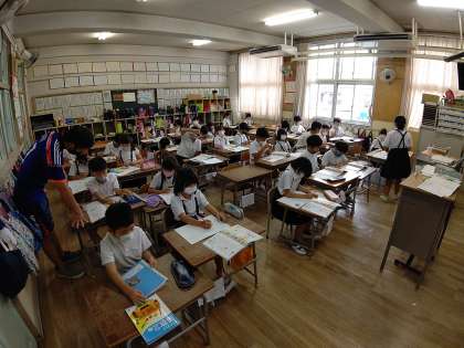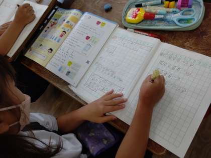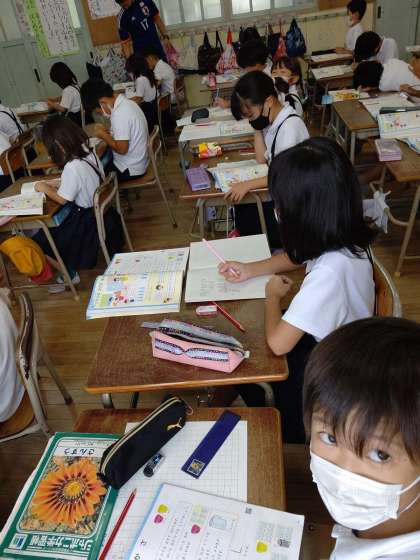 算数で、「かさをあらわすたんいについて考えよう」の学習をしています。