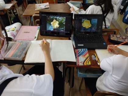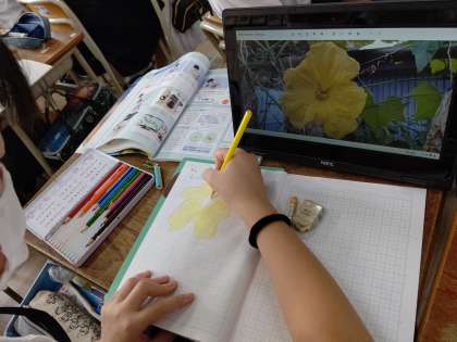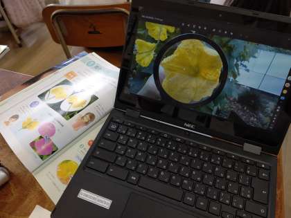 理科で、「ヘチマのめばなとおばなは、どんなつくりになっているだろうか。」のまとめを、chromebookを使って、観察の記録をしています。