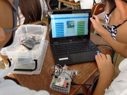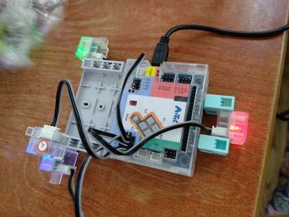 chromebookを使って、アーテックロボを制御するプログラミングソフトのスタディ−ノで、学習しています。タッチセンサー・光センサー・人感センサー・音センサーなどが使えます。今回は、センサーボードに赤外線フォトリフレクタを設定しています。