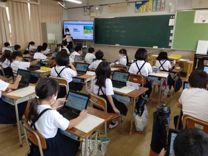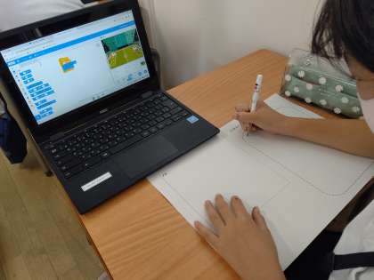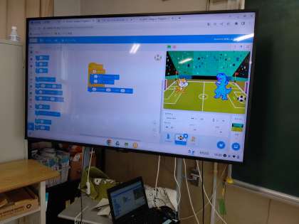 chromebookを使って、プログラミングソフトのスクラッチで、「サッカーのボールをパスしたい」のプログラムを考えています。