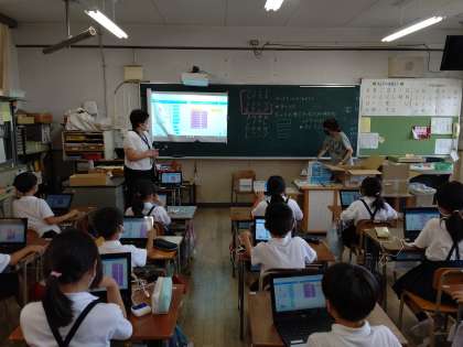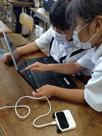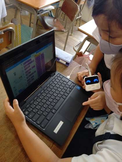 chromebookを使って、プログラミングソフトの「mblock」で、CodeyRockyにドレミの音階で学校のチャイムの音を鳴らしたり、ディスプレイの表情を変えたりするプログラムを、子どもたちが考えて作っています。