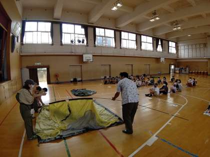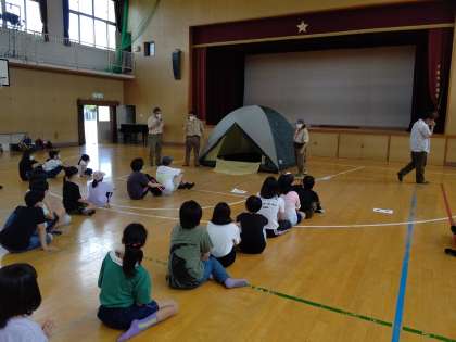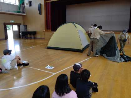 最初に、ボーイスカウトの方々から、テントの組み立ての説明をしてもらいました。