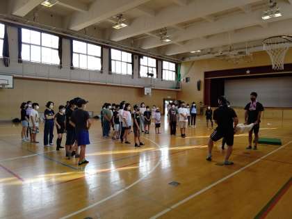防災学習で、消防署員の方々より、緊急の時に毛布で担架を作り、救助者を運ぶ方法などを学んでいます。