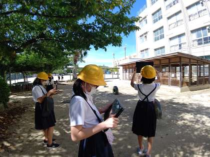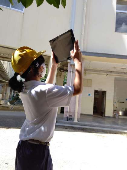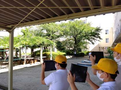 chromebookを使って、校舎の写真を撮り、図工で校舎の絵を描く資料集めをしています。