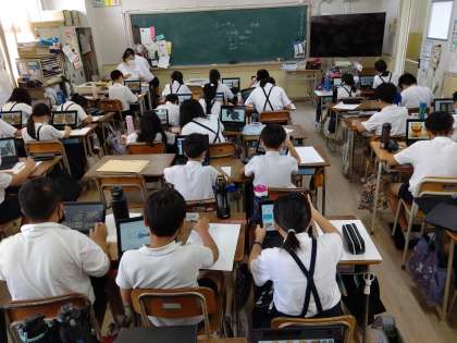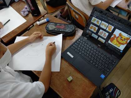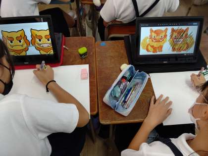 chromebookを使って、シーサーの画像を調べ、絵を描いています。