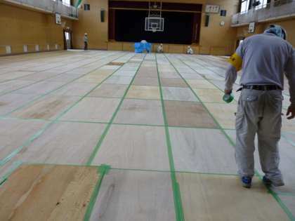 全面ベニヤ板でおおわれた体育館の床を見ると、大掛かりな工事であることを実感します。