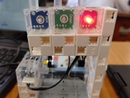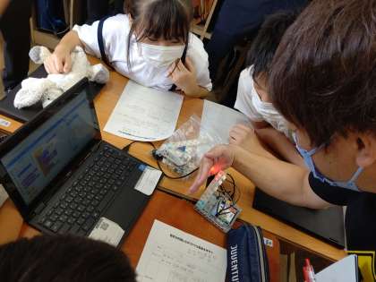 chromebookを使って、アーテックロボを制御するプログラミングソフトのスタディ−ノで、学習しています。人感センサー・タッチセンサー・LEDなどを使います。班で考えた課題を、解決するプログラムを考えています。