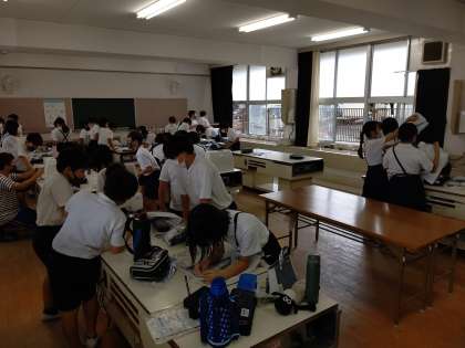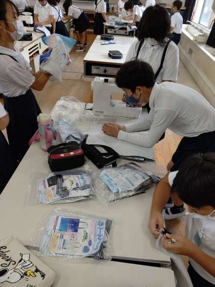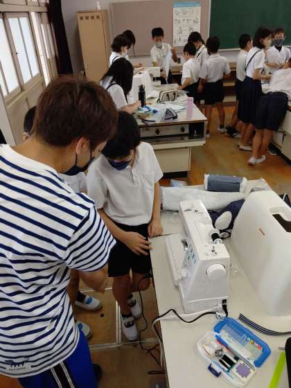 家庭科で、トートバッグの制作をしています。手縫いやミシンを使い、作業を進めています。