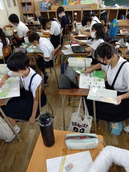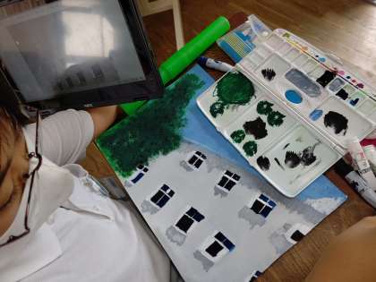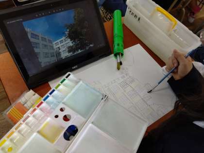 chromebookを使って撮影した、校舎の写真を模写しています。