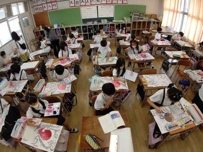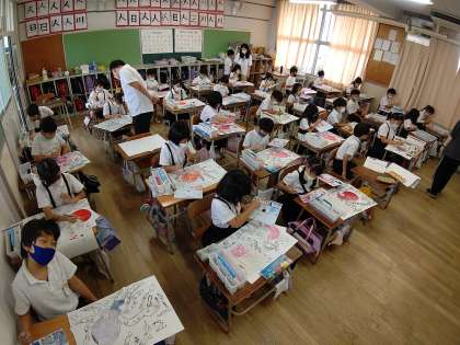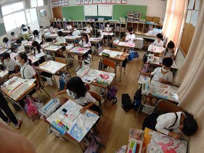 美術で、タコの絵を色の濃淡を上手に表現しています。