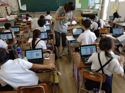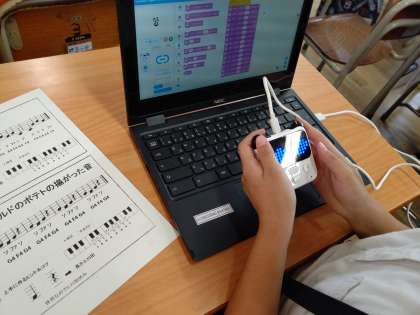 chromebookを使って、プログラミングソフトの「mblock」で、CodeyRockyにドレミの音階で学校のチャイムの音を鳴らしたり、ディスプレイの表情を変えたりするプログラムを、子どもたちが考えて作っています。