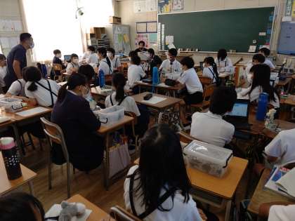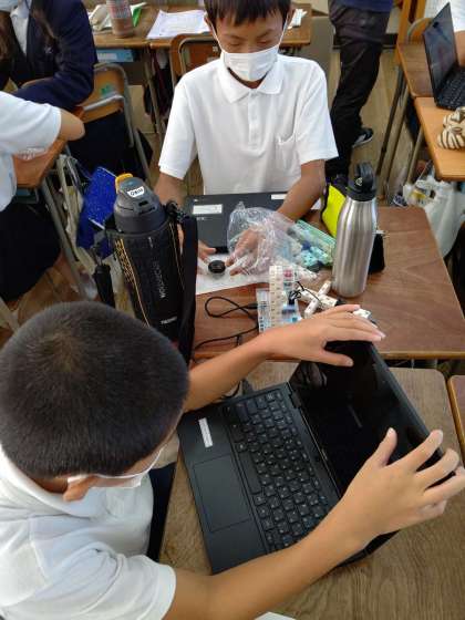 chromebookを使って、アーテックロボを制御するプログラミングソフトのスタディ−ノで、学習しています。人感センサー・タッチセンサー・LEDなどを使います。班で考えた課題を、解決するプログラムを考えています。
