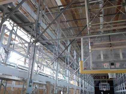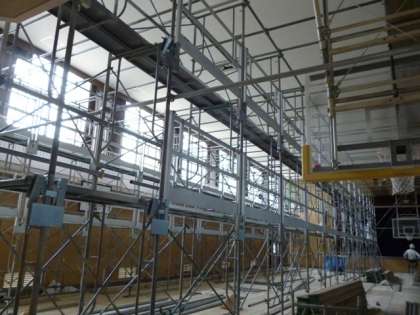 その最上階に板をはめ込み、体育館の天井まで届く足場の床が完成です。