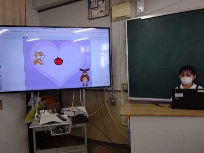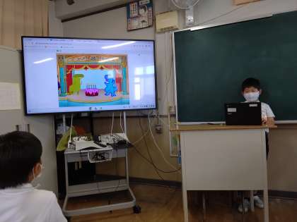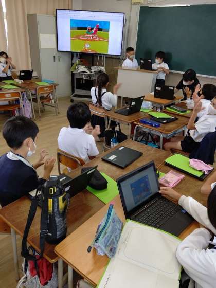chromebookを使って、プログラミングソフトのスクラッチで、「サッカーのボールをパスしたい」などの自分の考えをプログラムし発表しています。
