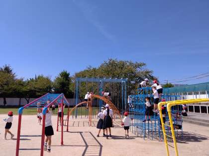 午前中でも少し気温が高くなってきていますが、元気に運動場で遊んでいます。