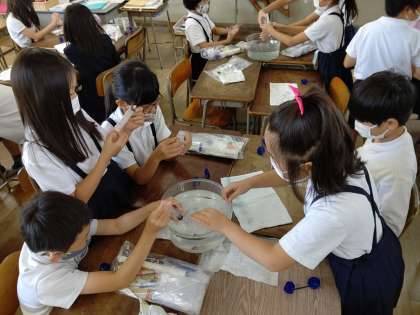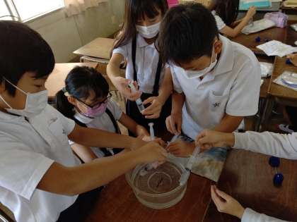 理科で、「空気と水をいっしょにとじこめるとどうなるだろうか。」の実験をちゅうしゃきと水そうを使って行いました。