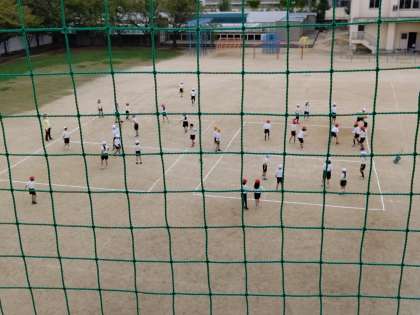 運動場で、おにごっこ、ドッジボールをしています。
