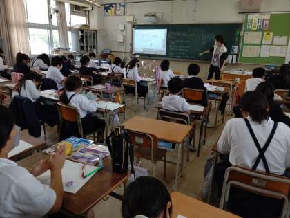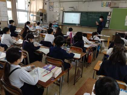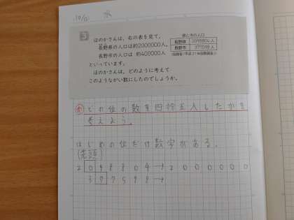 算数で、「どの位の数を四捨五入したかを考えよう。」をめあてに学習しています。