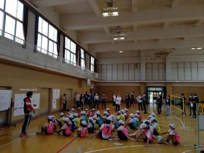 5時間目に講堂にて、5年生の体育科(プログラミング的思考)の研究授業を行いました。