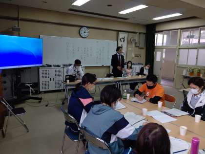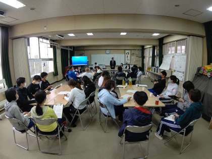 研究授業のあと、多目的室において、研究討議会を行いました。はじめに、学年の取り組みと授業者より説明がありました。