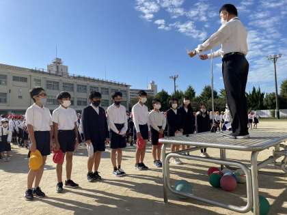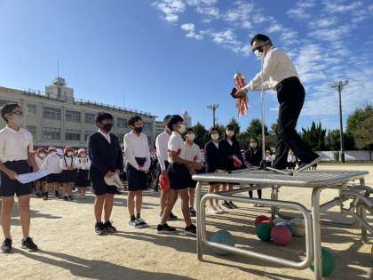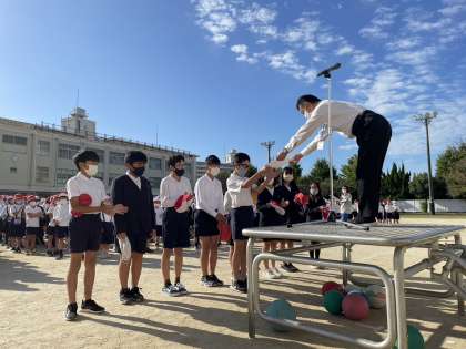 今朝の児童集会で、豊里連合子ども会ソフトボールチームの表彰を行いました。